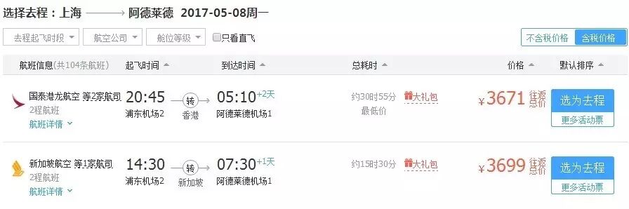 ▲上海淡季出发到阿德莱德,往返含税¥3600+,但要么是30个小时以上的耗时,要么是二转