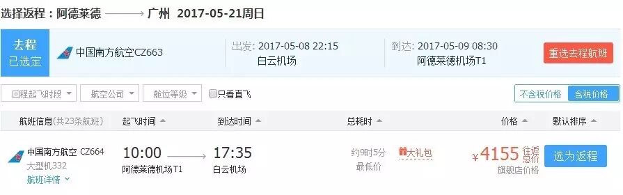 1、目前,国内航空只有南航 是有广州直飞阿德莱德 的航班,9个小时直达,淡季最低可至¥4000+,而且现在还有大促!五一期间(4.26~5.07,往返含税¥8300+) 。有时候,也有澳洲航空执飞的广州——阿德莱德。 ▲实时查询,广州直飞阿德莱德,5.8~5.21的往返含税价¥4100+