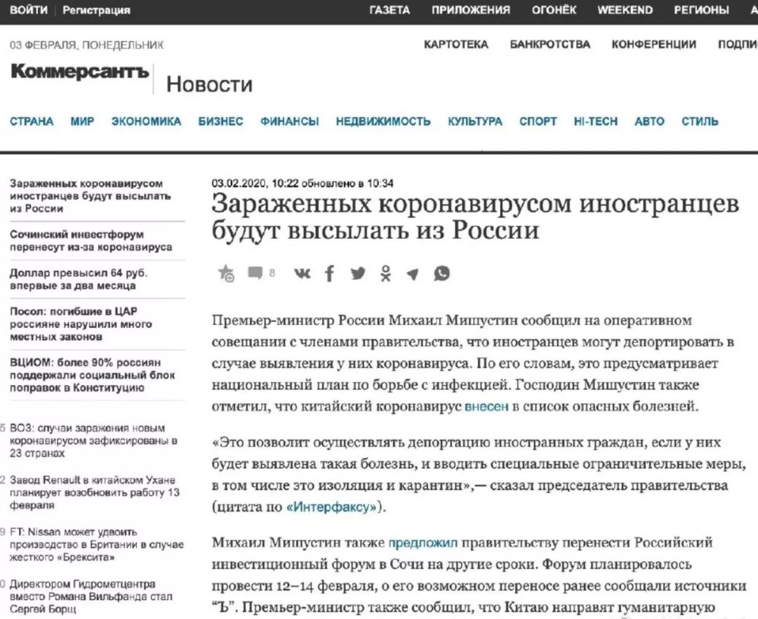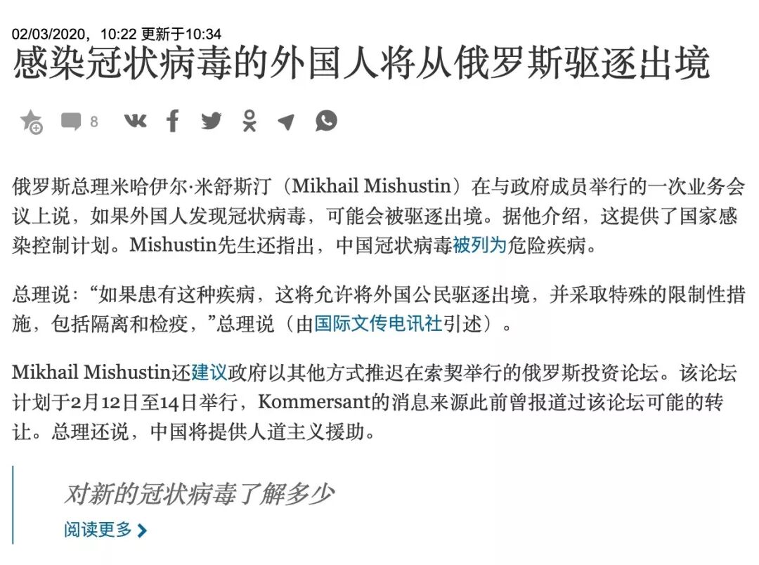 早在1月22日,朝鲜就关闭边境,是世界各国中反应最快的一个,俄罗斯也于1月30日关闭了远东边境。在2月3日,俄罗斯新总理米舒斯京宣布:如果有外国人感染新型冠状病毒,俄罗斯可能会将其驱逐出境。目前俄罗斯境内有两名感染者,他们都是中国公民。