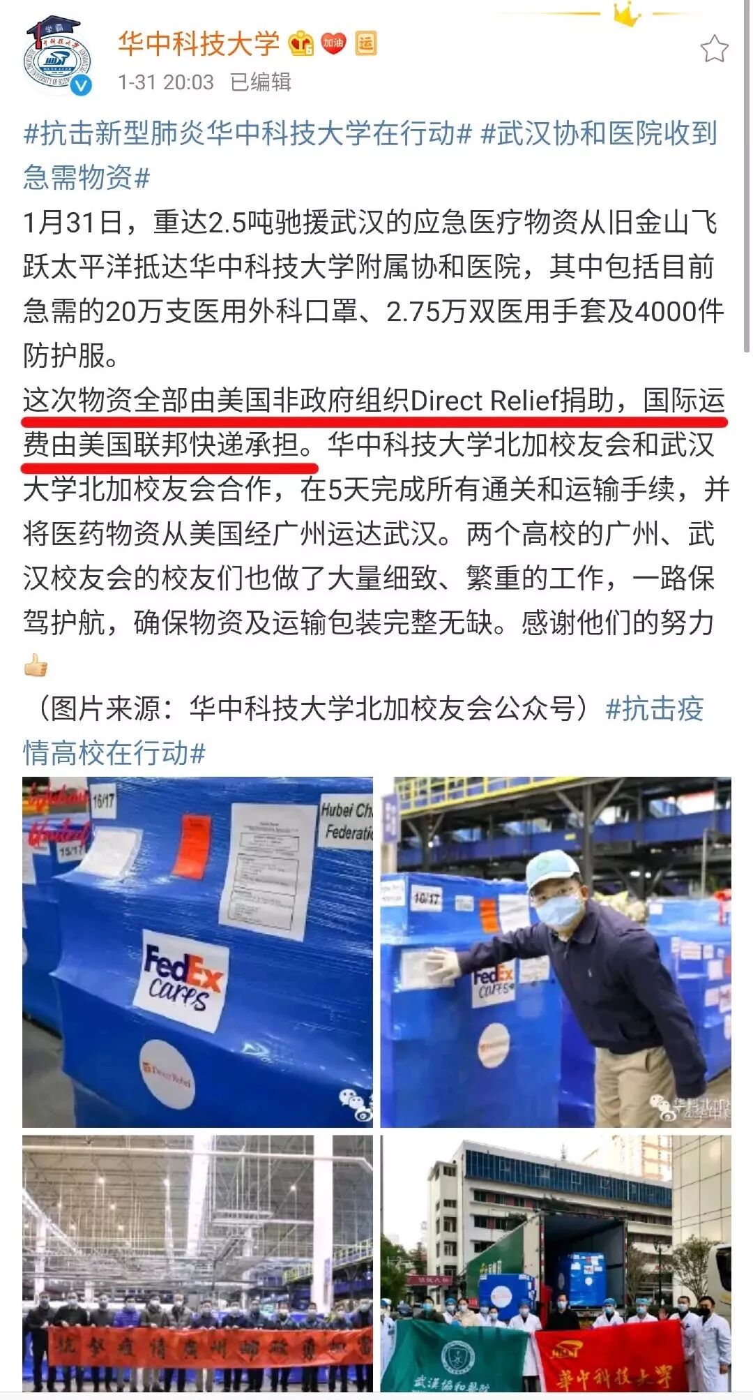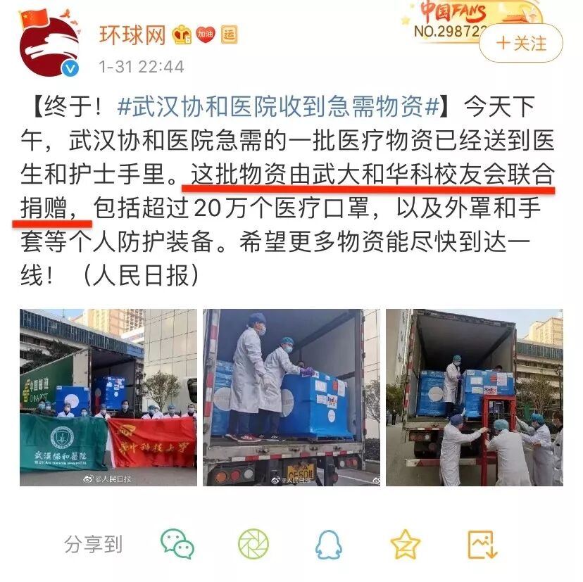 有趣的是,另一部分来自美国的捐赠被人为除名。武汉协和医院于1月31日受到了大量急需的医用物资,包括环球网在内的部分媒体表示:这批物资是由武大和华科校友联合捐赠。