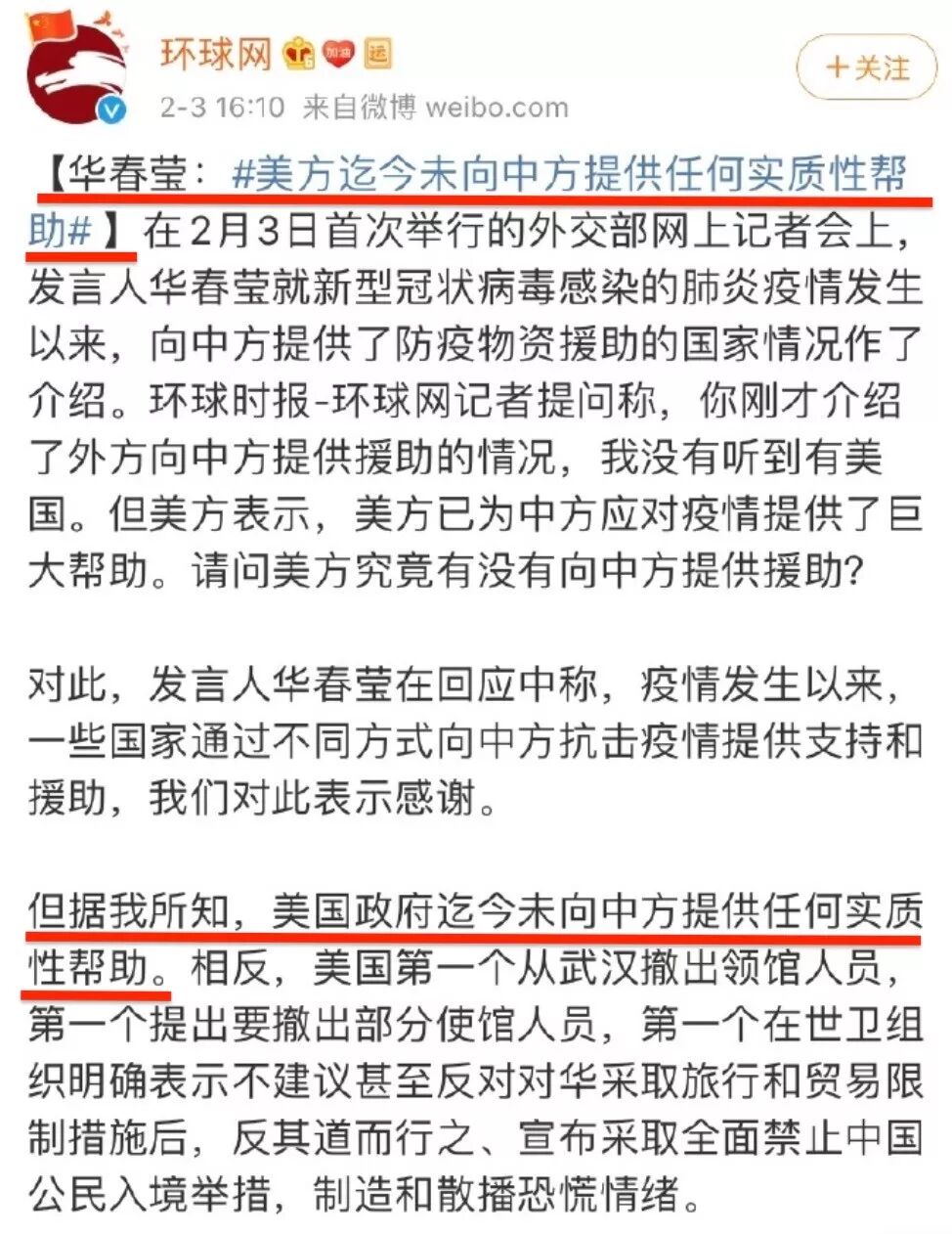 2月3日,一场网上记者会让观众们的注意力开始转向美国。发言人表示:美国政府迄今未向中方提供任何实质性帮助。而包括环球网在内的媒体再次打出一记擦边球,它们表示:美方迄今未向中方提供任何实质性帮助。