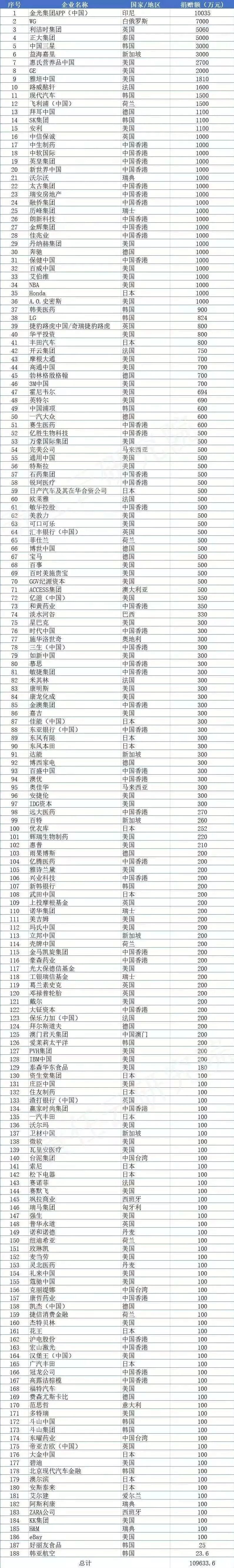 先看企业捐款,有机构统计了在这次疫情中向中国捐款的境外企业,我数了一下,在188家公司中,美国公司占58家,占比31%,如果除去41家港澳台公司而只计算其他国家公司,那么美国公司占比接近40%,请注意,这里用数字说话,没有预设立场、也没有情绪。在此,感谢包括美企在内的所有境外公司对我们的帮助!