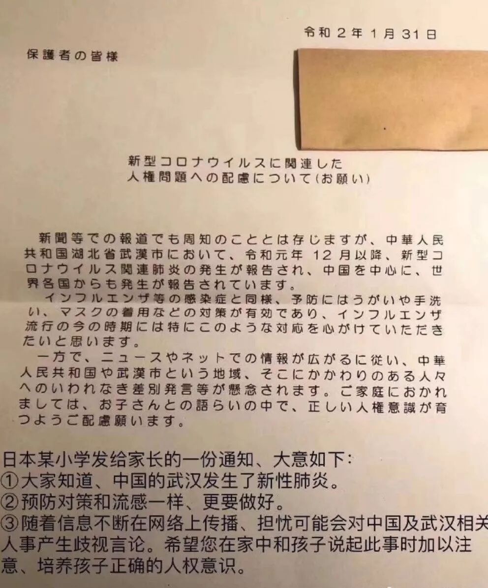 更重要的是,大多数国家对我们的态度是关爱和同情的。下面是一个网友分享的日本某小学给学生家长的一份通知,通知的最后还不忘强调避免孩子产生对中国及武汉相关的人和事产生歧视。