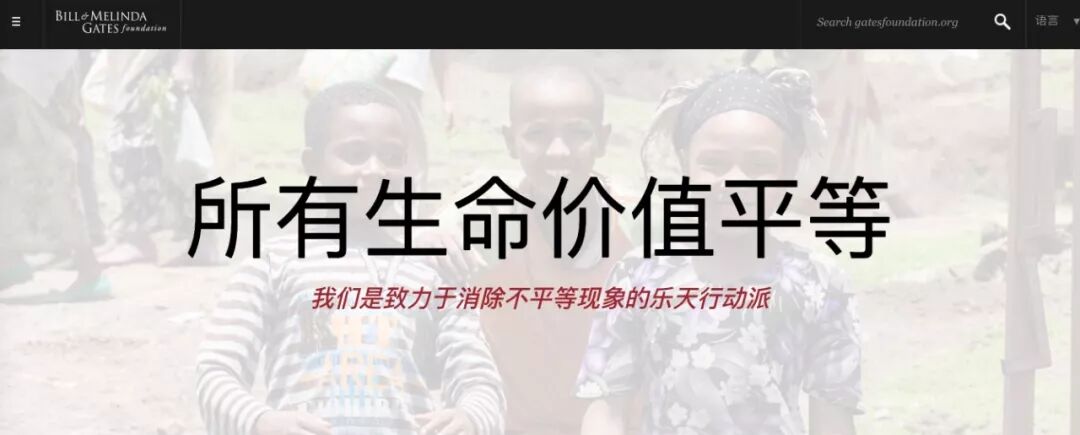 比尔及梅琳达·盖茨基金会的首页写着一句话:所有生命价值平等-我们是致力于消除不平等现象的乐天行动派。这句话的背景照片是三个快乐的非洲孩子。